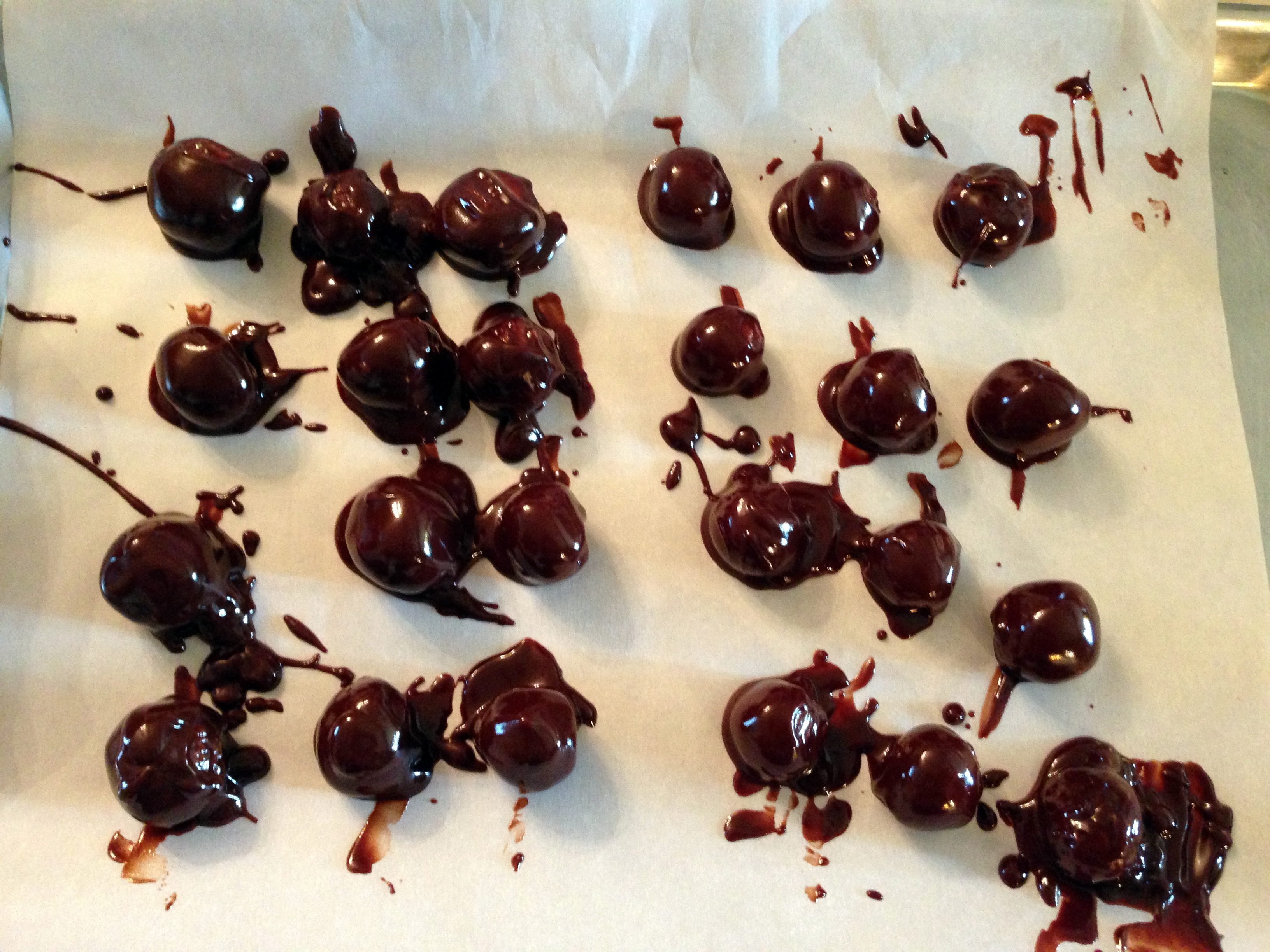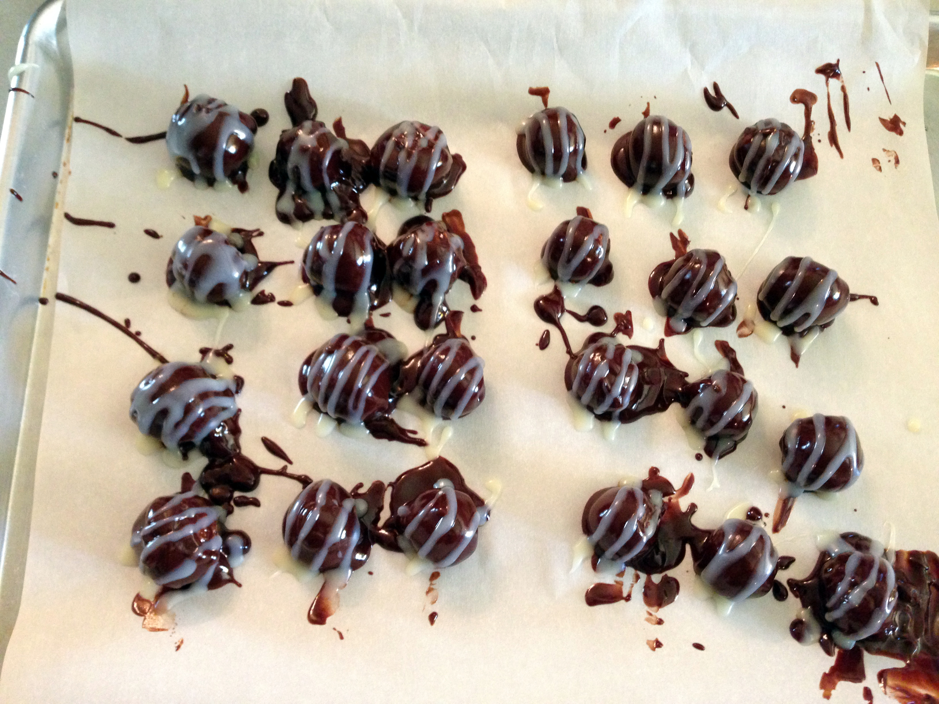 Anyways, I left the filling to set overnight and went about making the ganache. Let me just say those Wilton candy melts are definitely easier to work with than actual chocolate, but I wanted to use the choco I had. I rolled the filling in the ganache and made a hot mess of things, but it’s all good. I’m still in the testing phase. Plus I cheated on the peanut butter, only using Skippy. I want to handmake it once I start up ze biz.