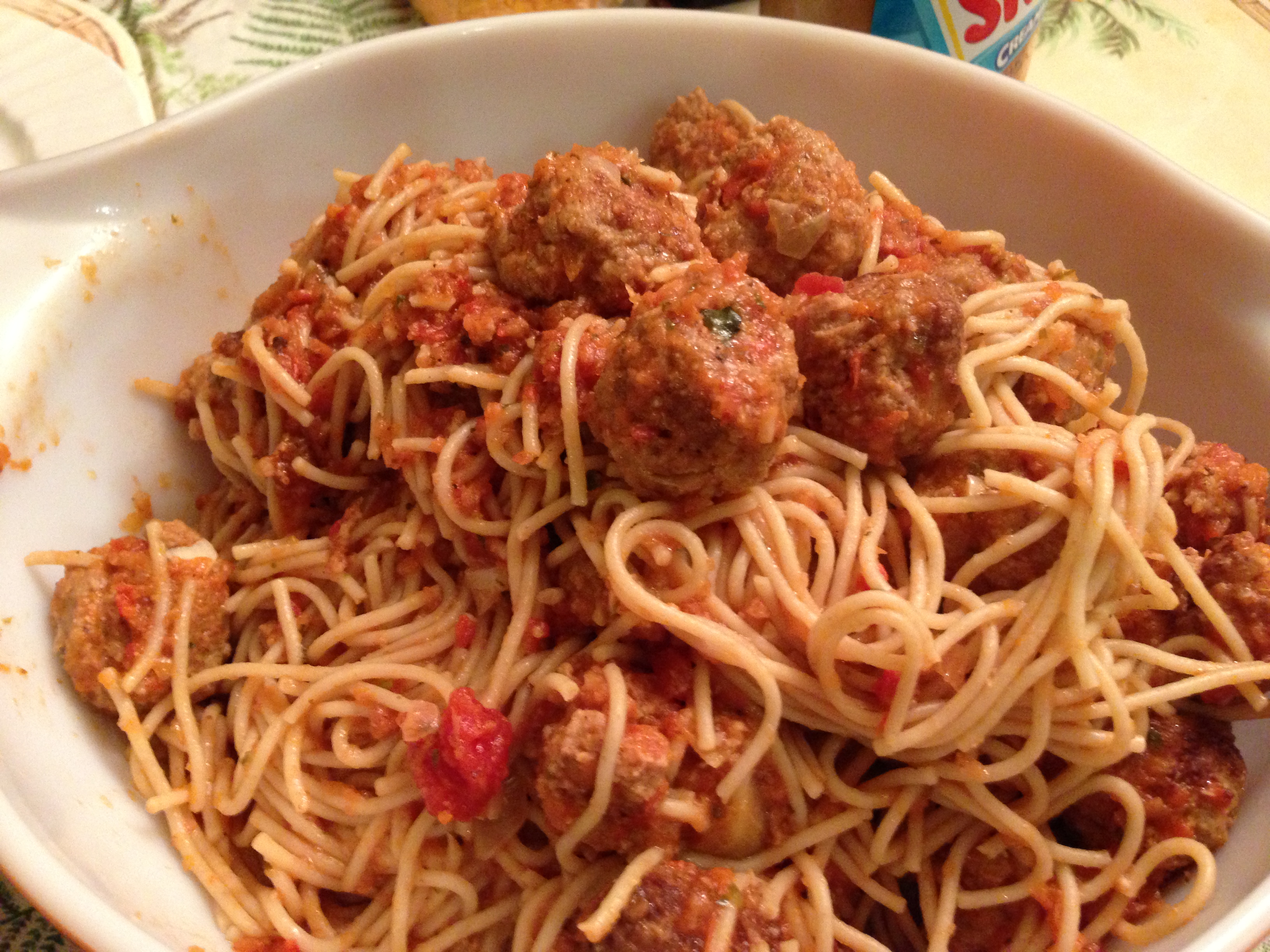 Then I fried the meatballs (sorry, I didn’t feel comfortable just popping them into a sauce and hoping they cook) and then cooked the sauce. I followed the directions on the box of whole wheat spag, drained the pasta and then folded into the sauce.