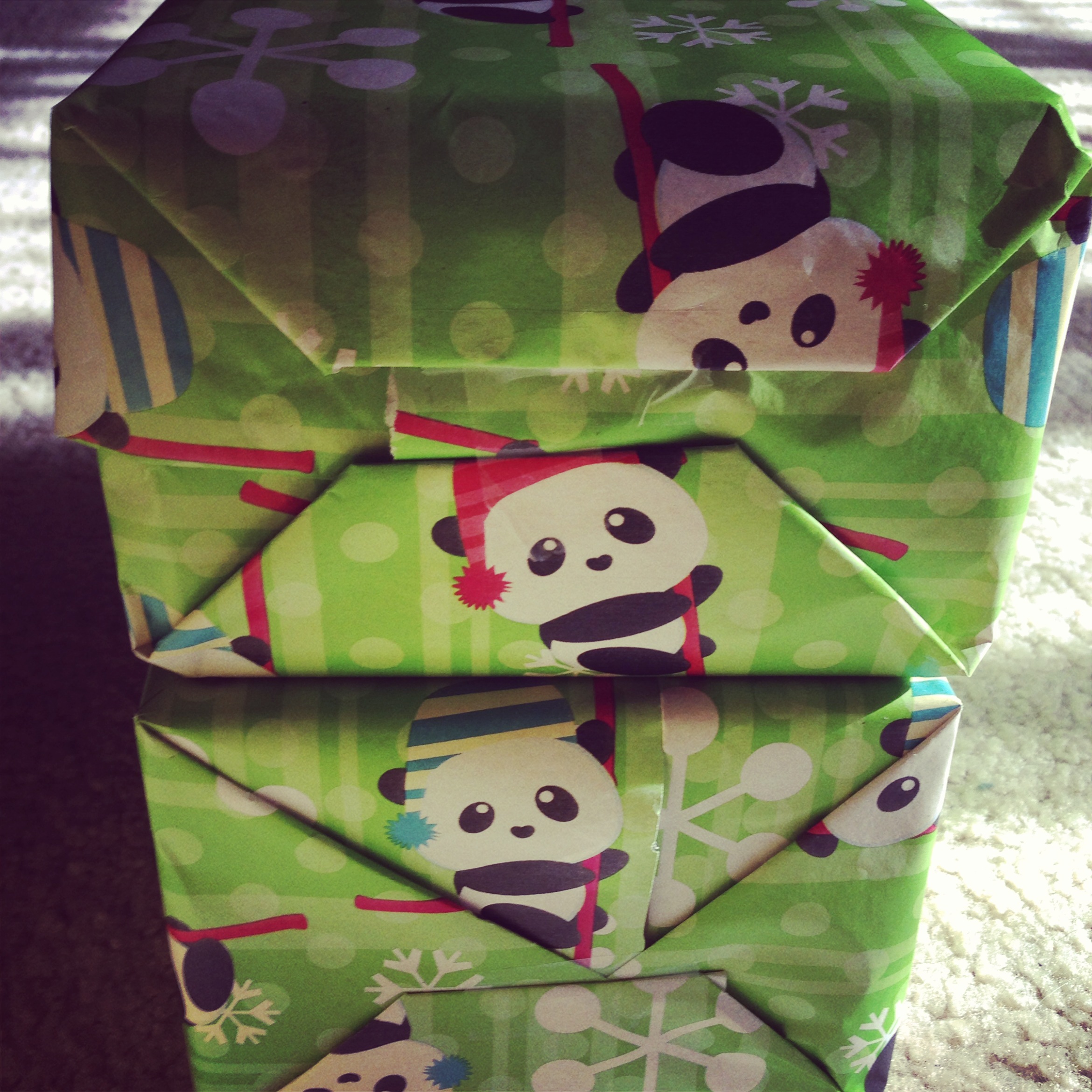 Ahtee Bee and her man came by for a visit yesterday and I finally got a chance to give her the Christmas presents we got her. I picked out a pair of super comfy black flats and some hip and with-it Minnetonka mocs for her. I hastily wrapped them in panda christmas wrapping paper.