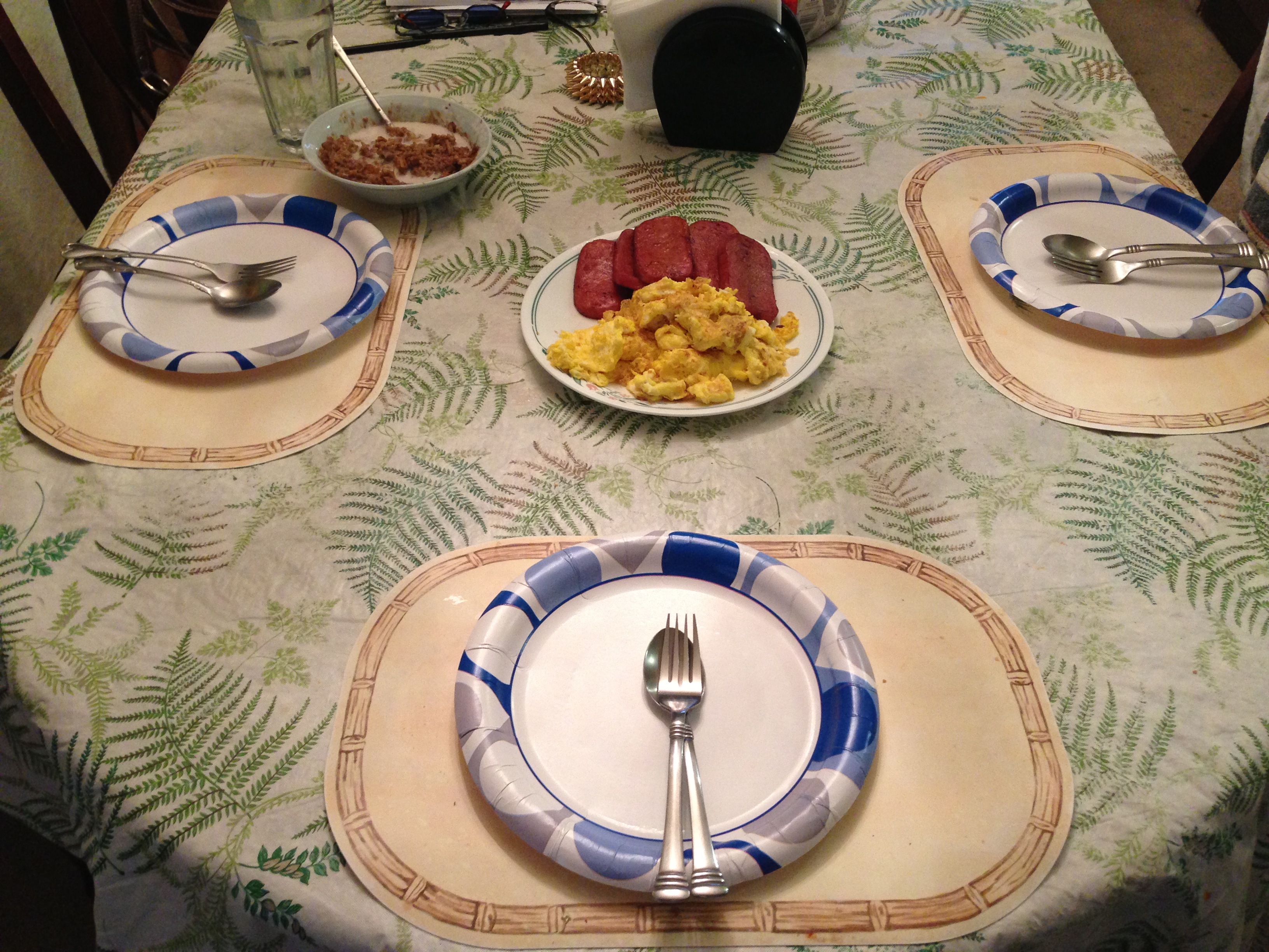 This morning started with a traditional Filipino breakfast: Spamilog! Well… what I think is spamilog. For you non-Filipinos, Spam + itlog (egg) = spamilog, so really just spam and eggs for brekkie this morning. Two days in a row that I cooked for Big Momma Bee! It must be a record. It’s weird, as I was cooking, a sense of calm happiness washed over me. It’s really great to be at home with everyone here. Well, everyone being everyone who lives here. I don’t know if there’ll ever be an “everyone” as I used to know, ever again.